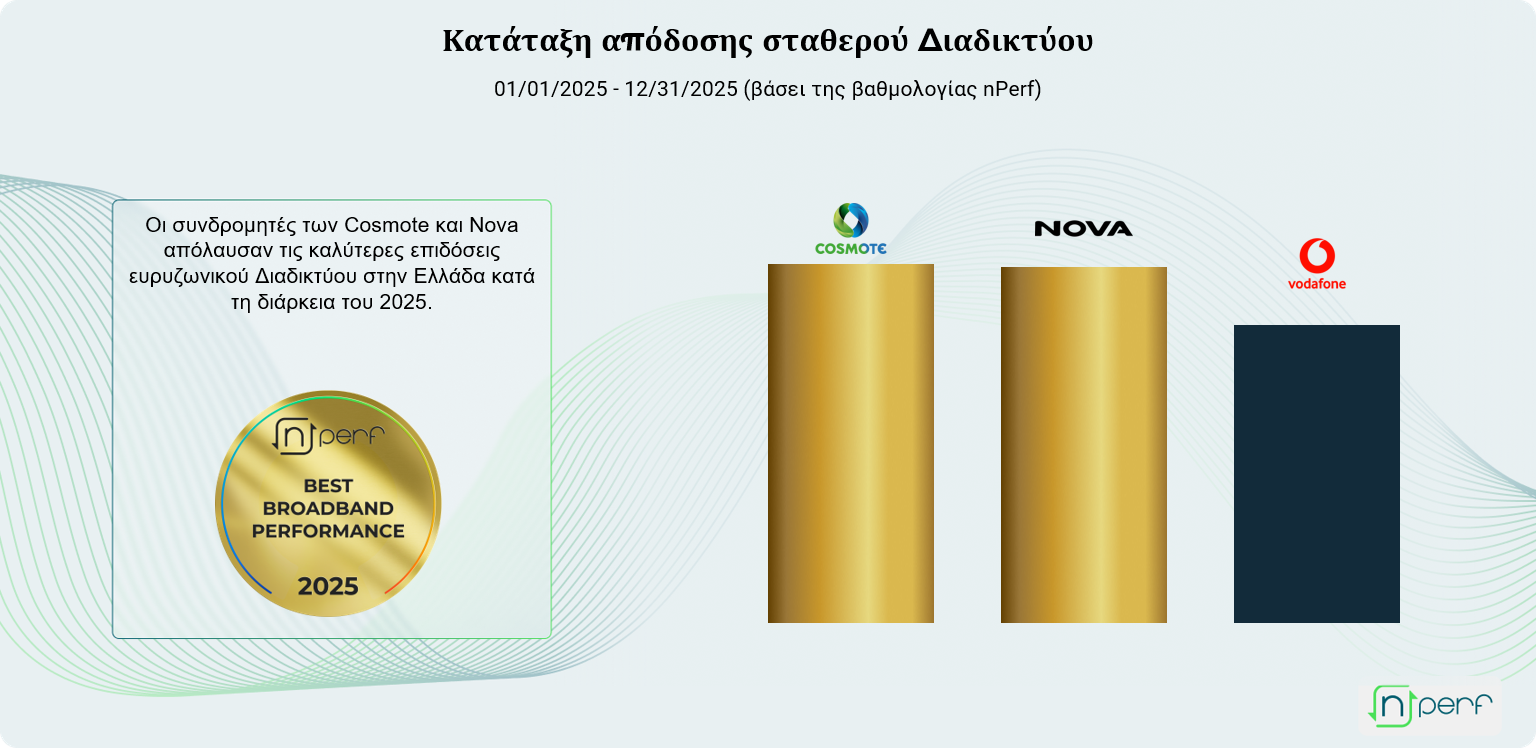 Η Cosmote και η Nova μοιράζονται την πρώτη θέση του σταθερού Internet στην Ελλάδα για το 2025, σύμφωνα με το ετήσιο βαρόμετρο nPerf. Αυτή η έκδοση αποκαλύπτει έναν δυναμικό τομέα με διψήφια αύξηση για όλους τους παρόχους και συμπληρωματικά δυνατά σημεία μεταξύ των ηγετών.