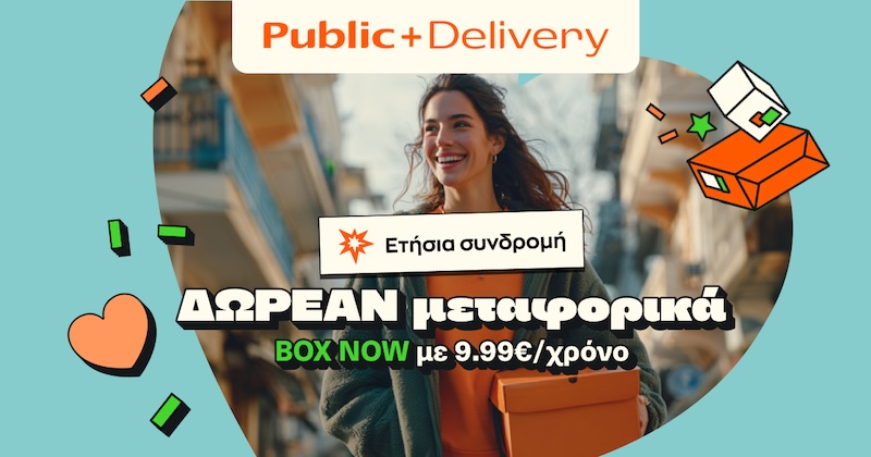Τα Public παρουσιάζουν το “Public+ Delivery”, τη νέα συνδρομητική υπηρεσία που αναβαθμίζει την εμπειρία των αγορών, προσφέροντας δωρεάν μεταφορικά σε BOX NOW lockers. Με μόλις 9,99€, τα μέλη του Public+ εξασφαλίζουν δωρεάν αποστολές για παραγγελίες αξίας 15€ και άνω, για έναν ολόκληρο χρόνο, απολαμβάνοντας μια οικονομική, ευέλικτη και αξιόπιστη λύση παράδοση σε όλη την Ελλάδα.