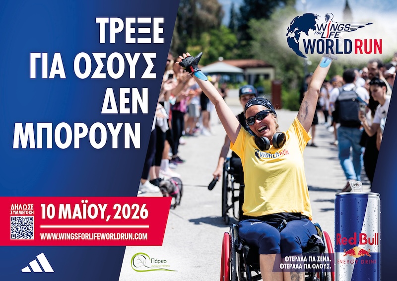 Την Κυριακή 10 Μαΐου 2026, φόρα τα αθλητικά σου και γίνε μέρος της πιο δυνατής παγκόσμιας δρομικής εμπειρίας, το Wings for Life World Run. Ένας αγώνας με πραγματικό νόημα, όπου τρέχουμε για όσους δεν μπορούν. Στην Αττική, το Μητροπολιτικό Πάρκο «Αντώνης Τρίτσης» γίνεται το σημείο συνάντησης, με μία κυκλική διαδρομή 1,8 χλμ. που θα γεμίσει ενέργεια, παλμό και χαμόγελα.